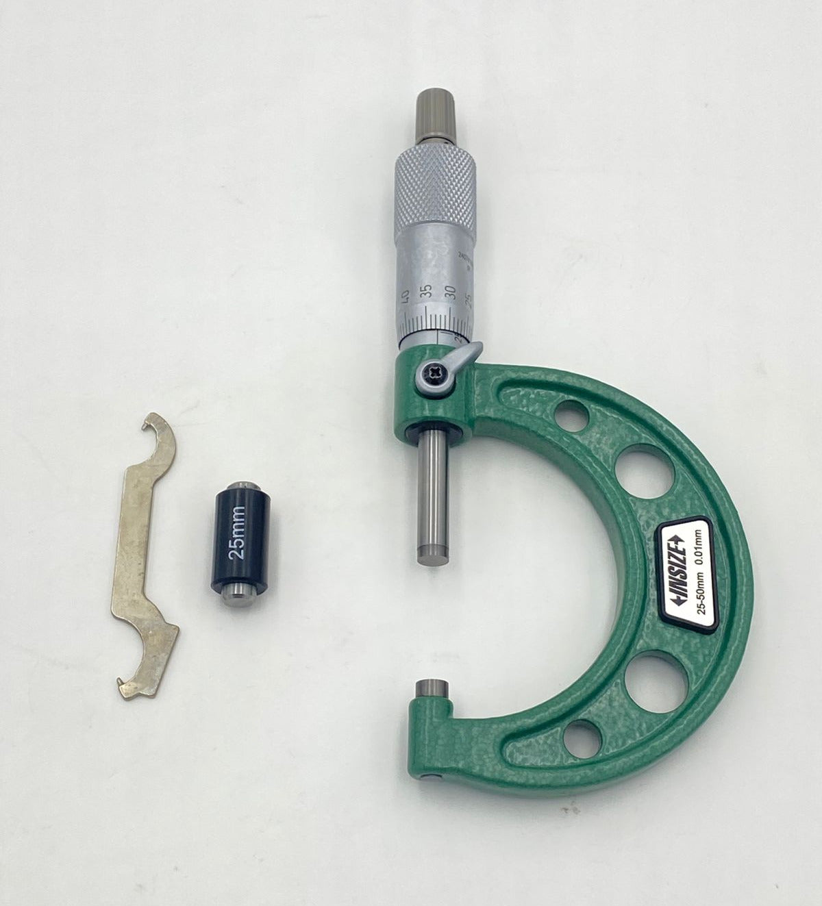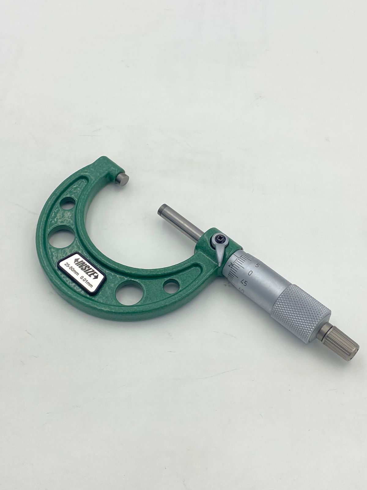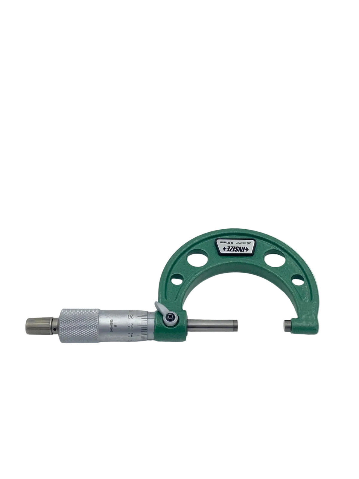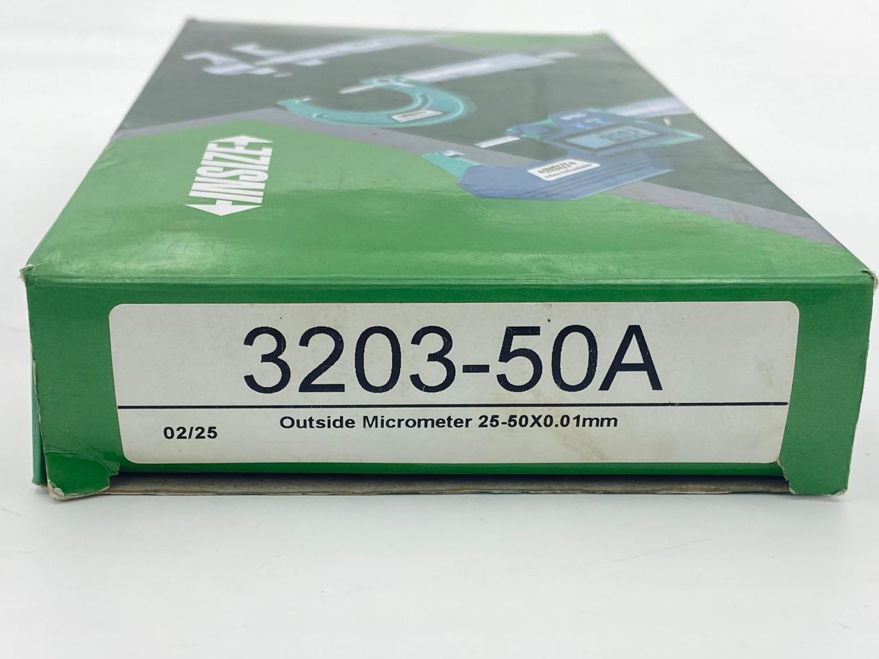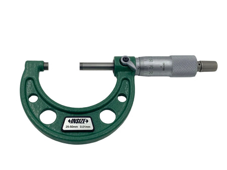 INSIZE 3203-50A precision outside micrometer for accurate 25–50mm external measurements with 0.01mm resolution, hardened spindle and anvil, smooth thimble rotation, clear graduations, ideal for quality control and machining applications.